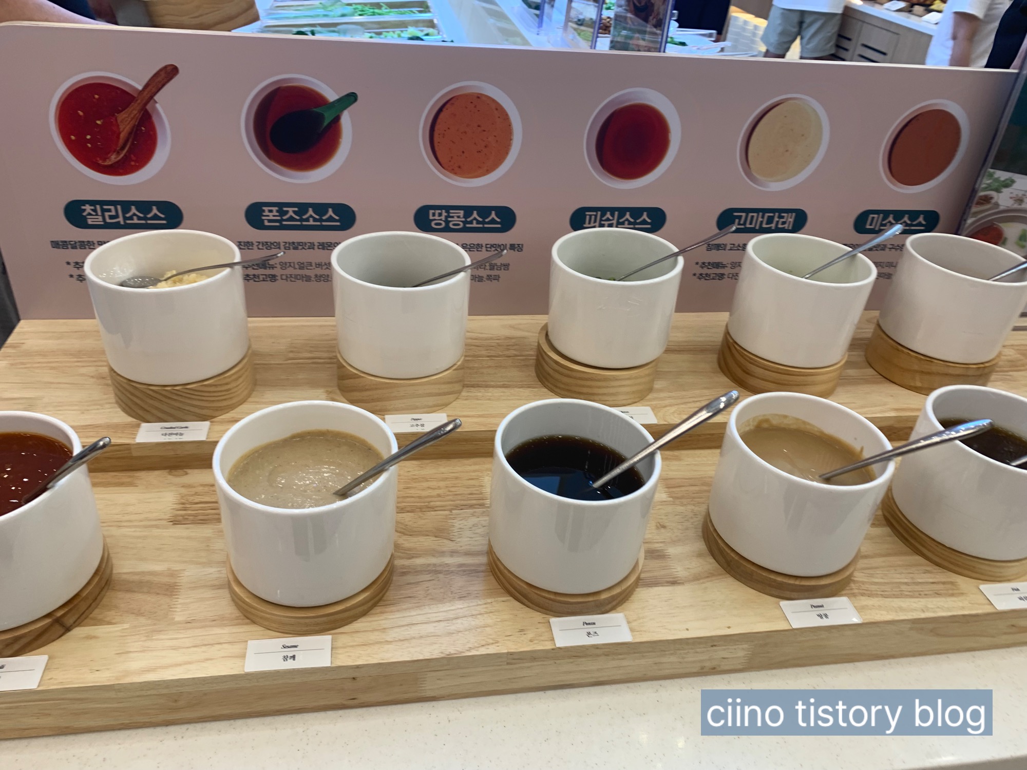 소스 코너에는 참깨소스, 간장소스, 칠리소스, 다진 마늘, 고추, 파 등이 준비돼 있었는데, 저는 참깨소스에 약간의 칠리소스를 섞어 먹는 조합이 가장 좋았습니다.