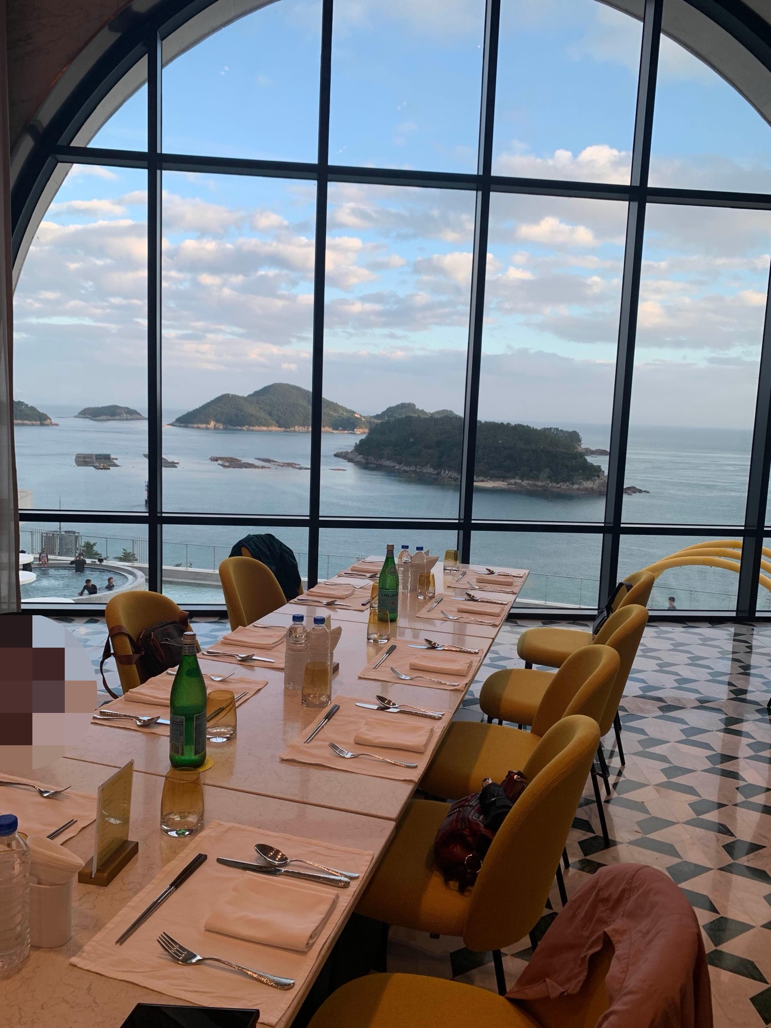 저번과는 반대 방향으로 더 바다가 잘 보이는 곳이었습니다. 큰 통창이 분위기를 한껏 업시켜주었습니다. 자리에 앉으면 바다 전망이 한눈에 들어왔습니다.
