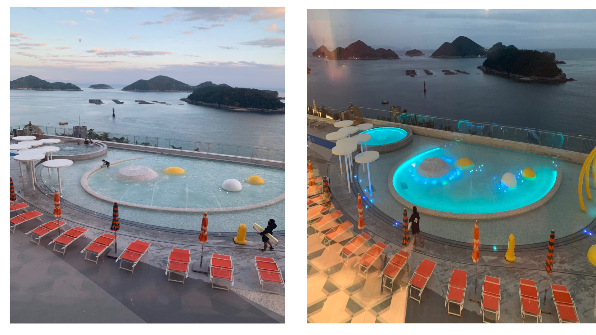 레스토랑에서 수영장이 보였습니다 저녁을 먹다 보니 수영장에 불이 켜졌습니다