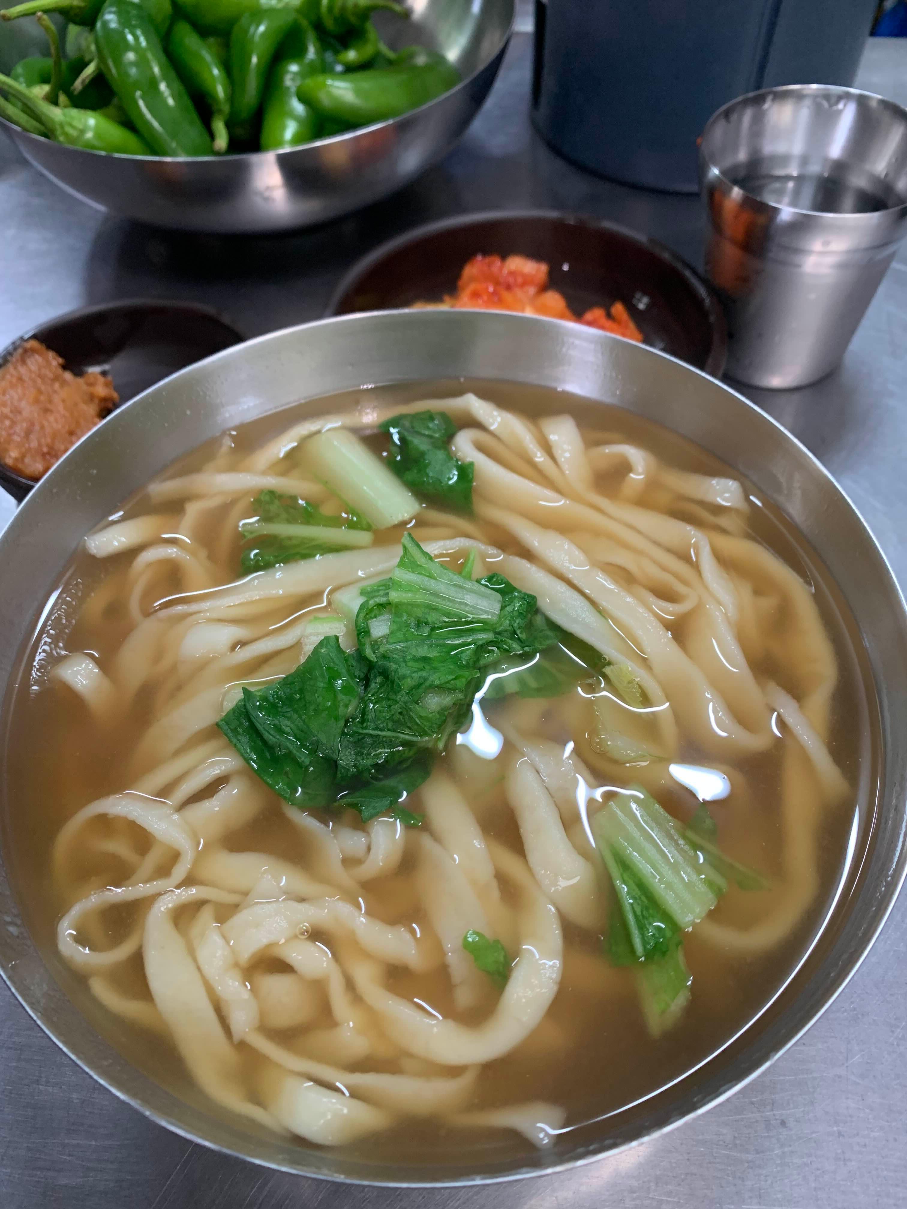 자리에 앉자마자 뜨거운 칼국수 한 그릇이 나왔는데, 면발이 쫄깃하고 국물은 진하면서도 담백했습니다. 멸치와 다시마로 우려낸 깊은 맛에 대파와 마늘 향이 은은하게 더해져, 아침 공복에 먹기에 부담이 없었습니다.