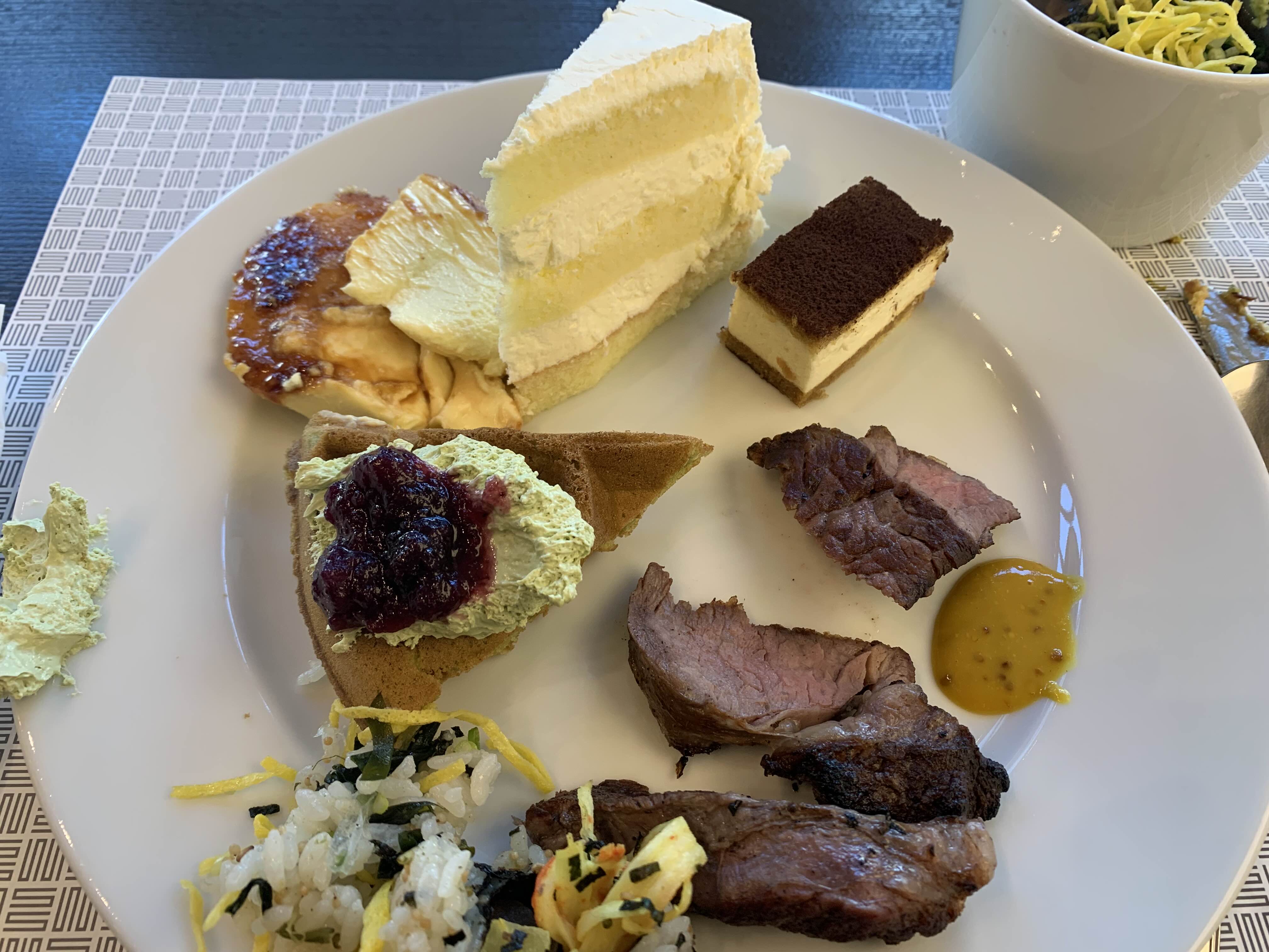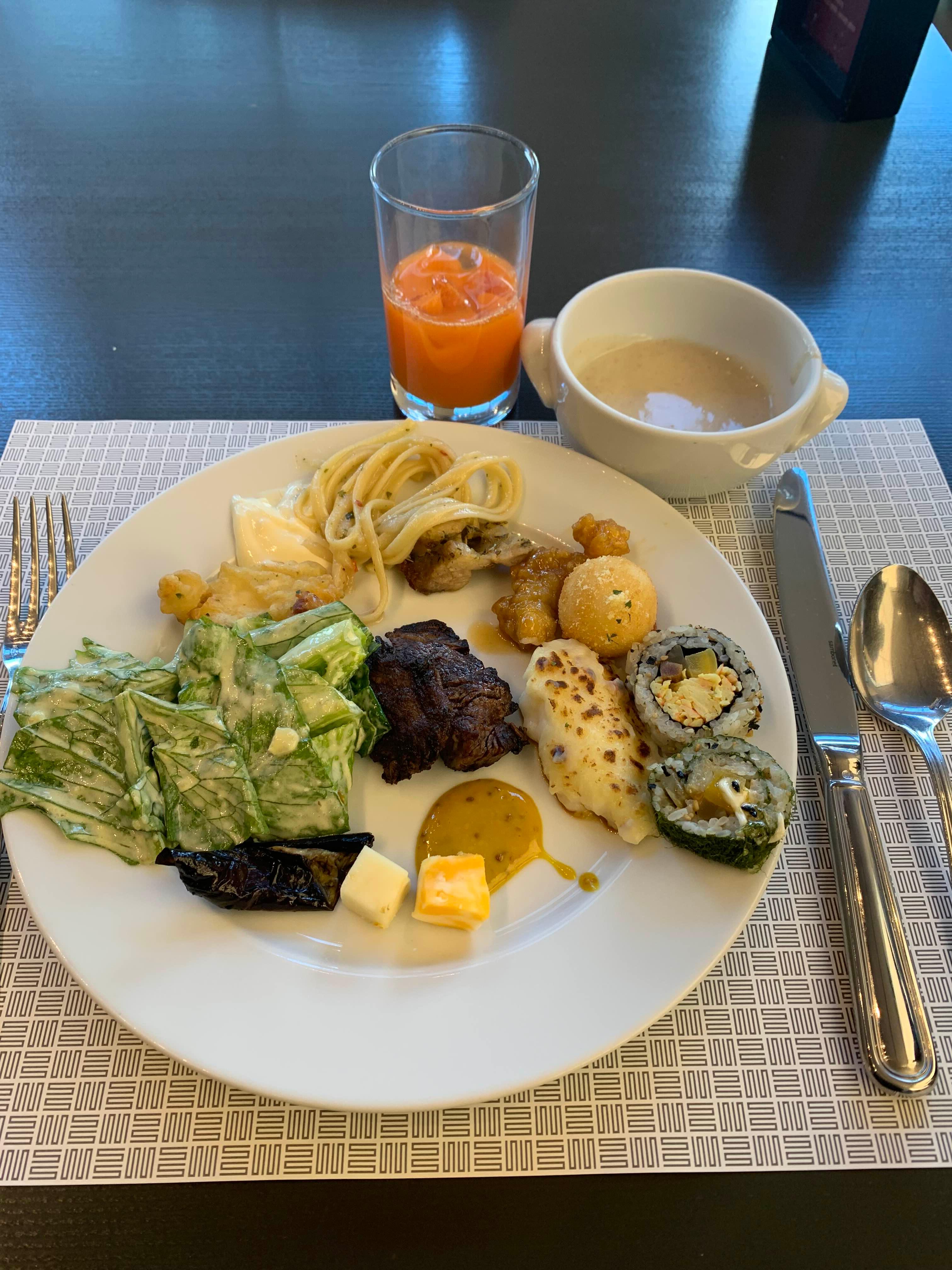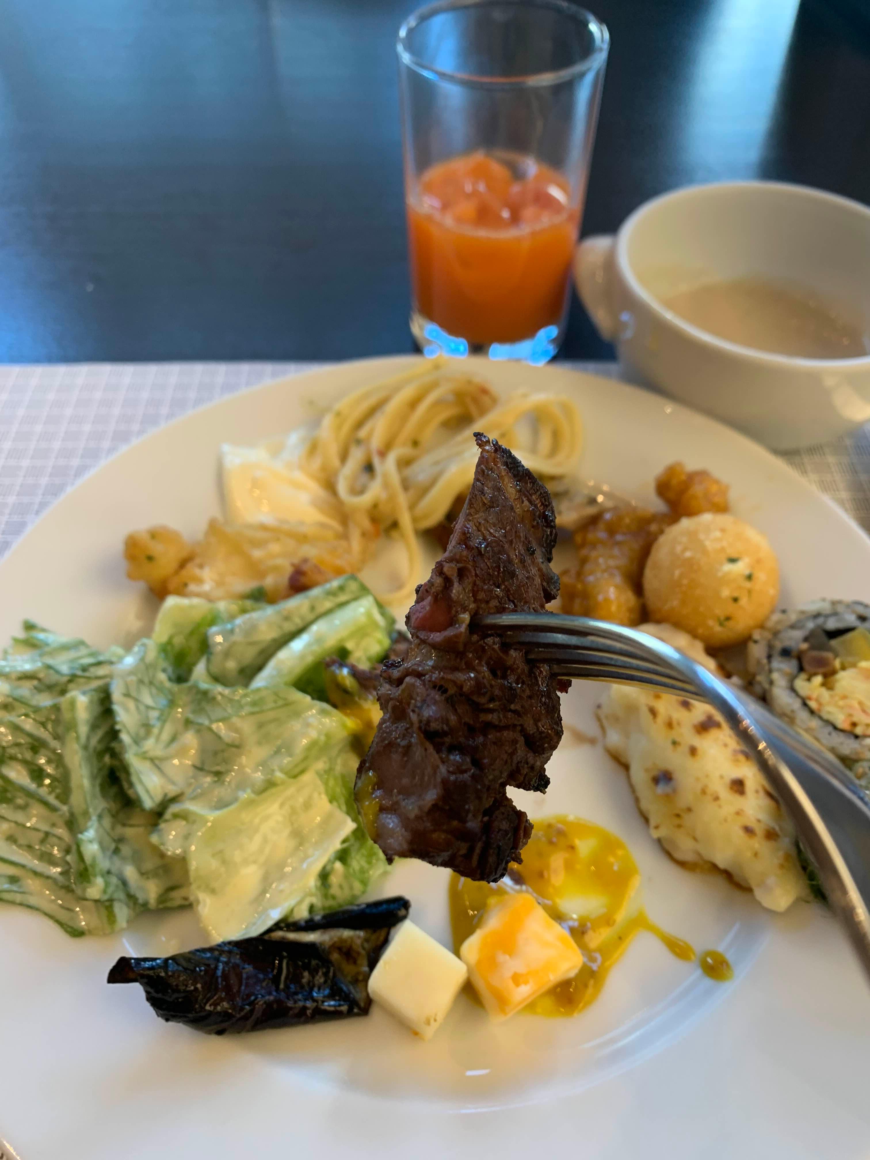 제가 제일 맛있게 먹은 건 당근주스와 스테이크였어요. 버터도 발라서 먹으니 풍미가 좋았습니다. 하지만 나중에 먹은 스테이크는 식어서인지 처음보단 부드럽지 않았어요. 파스타도 무난하게 괜찮았고, 시저 샐러드도 취향저격, 디저트는 종류는 많지 않지만 깔끔하게 마무리하기 딱 좋았어요.