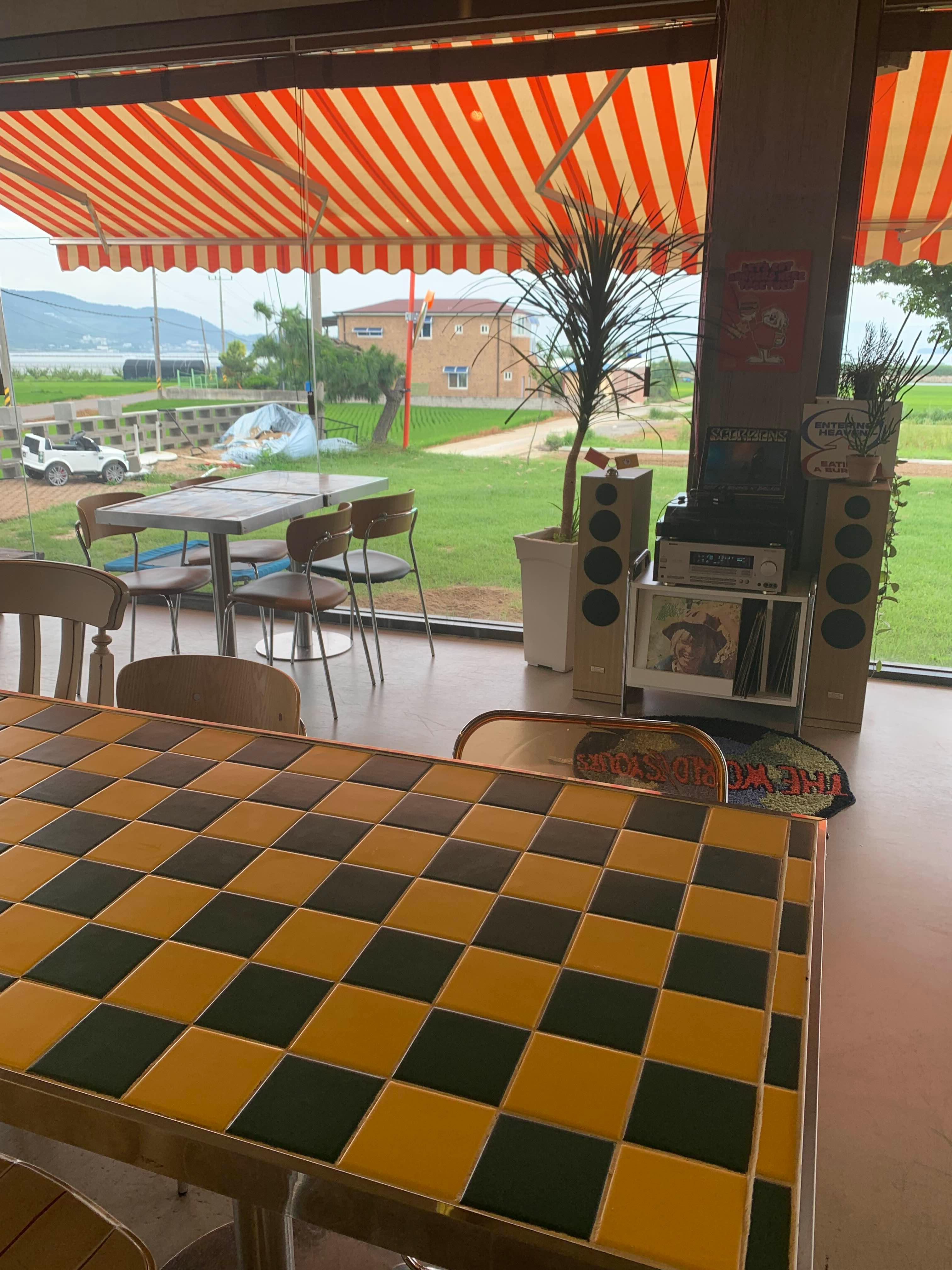 창가석에 앉으면 바로 앞에 푸른 논이 펼쳐지고, 그 뒤로 시원하게 이어지는 바다뷰가 보입니다.