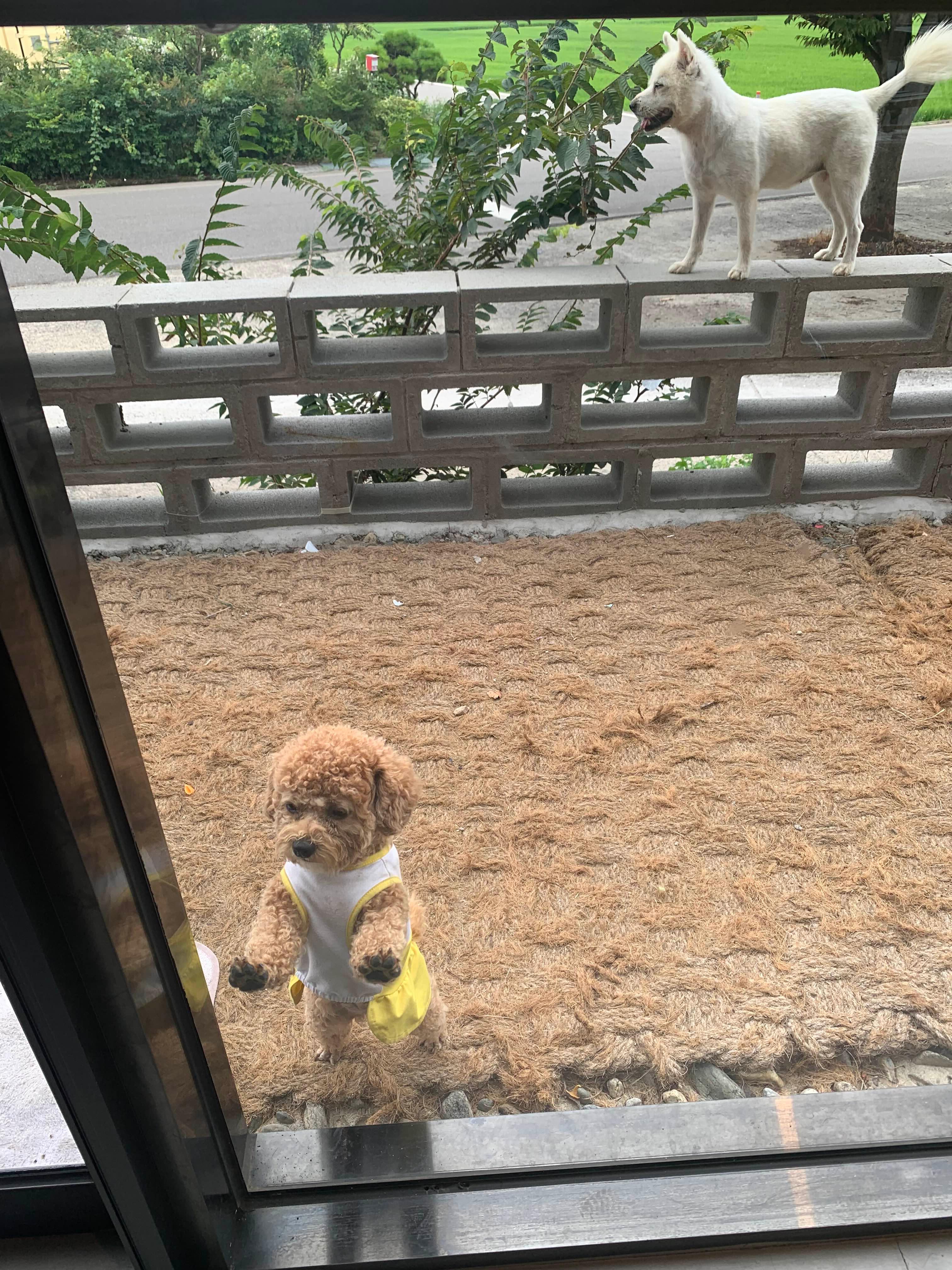 야외 테라스 쪽에는 강아지 세 마리가 여유롭게 놀고 있었습니다.