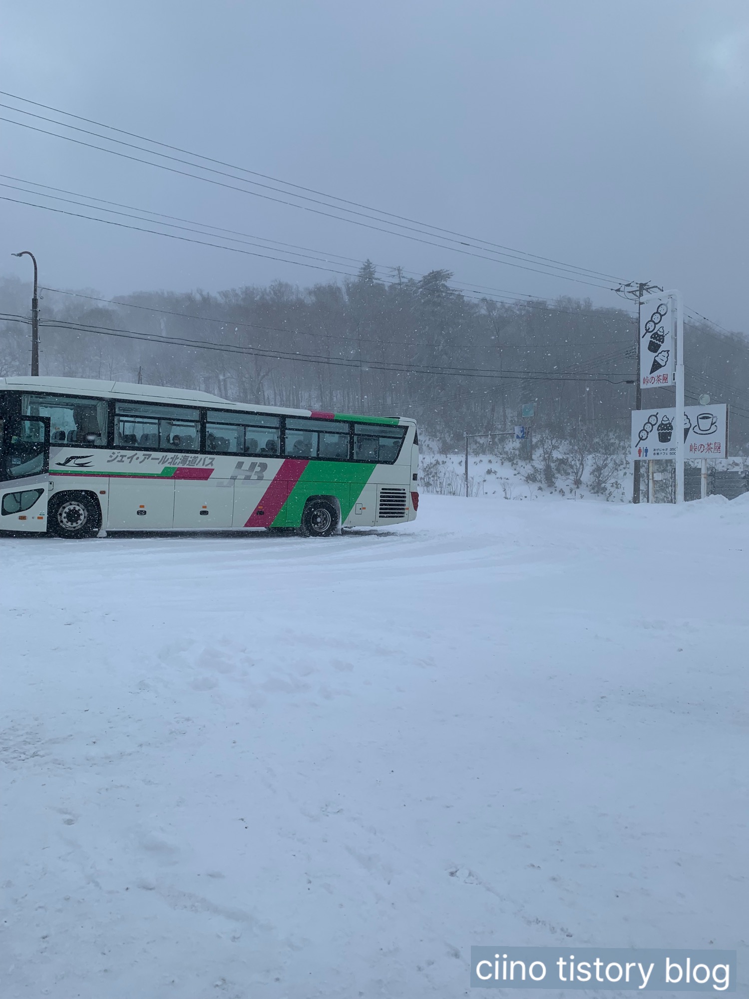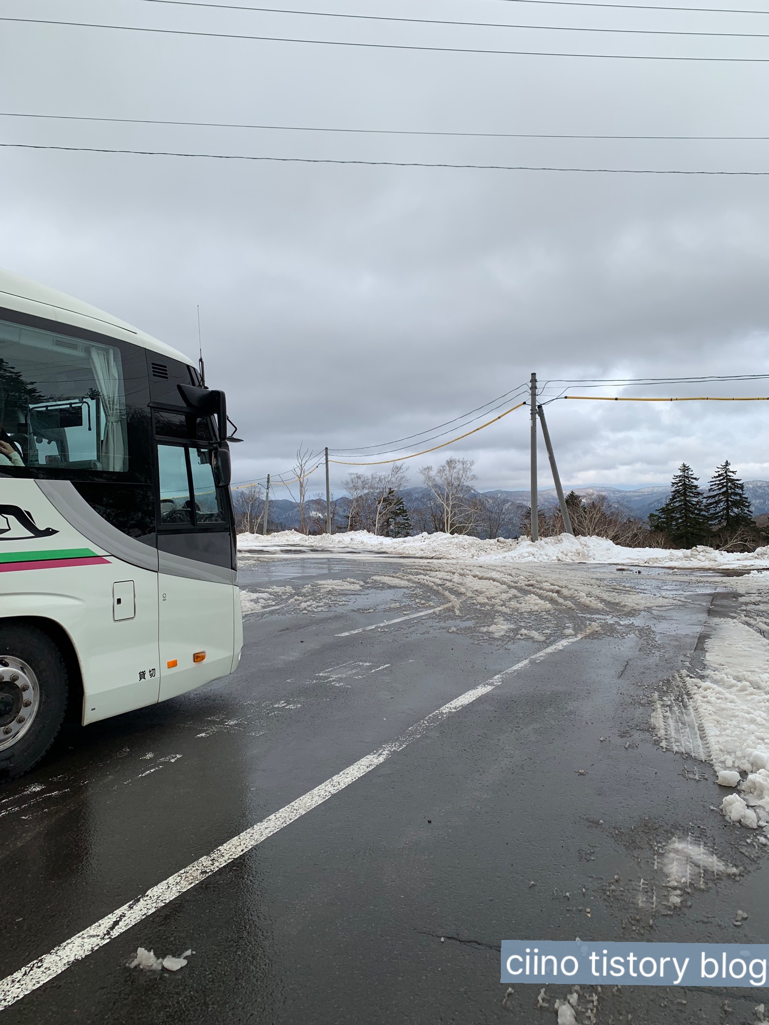 아침에 송영버스를 타고 온천 숙소로 이동했어요. 창밖으로 보이는 삿포로 설경은 정말 그림 같았어요. 눈 덮인 산과 나무들이 펼쳐져서, 겨울 홋카이도 여행 분위기를 제대로 느낄 수 있었습니다.