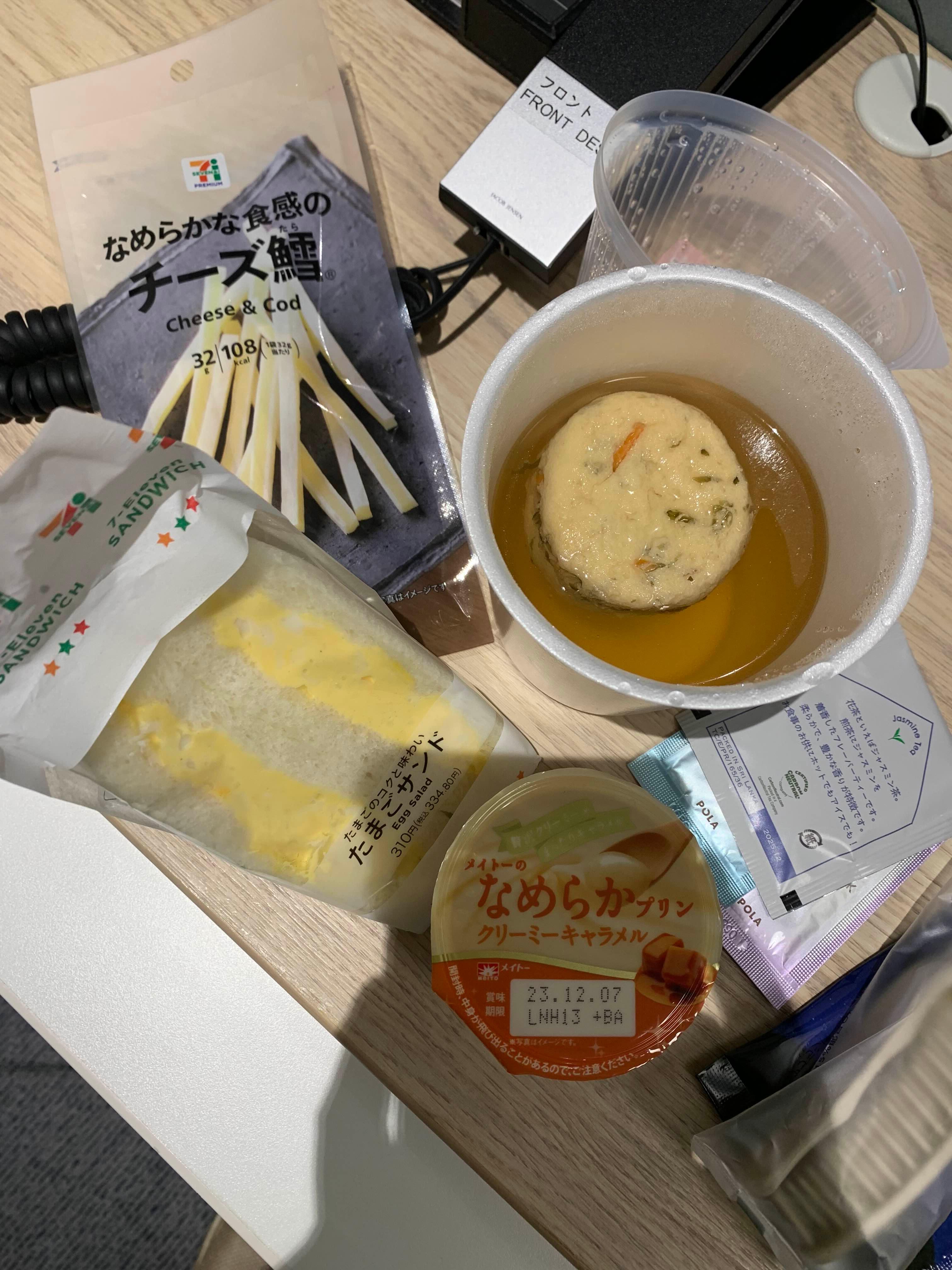 캐리어 끌고 걷다 보니 일본 겨울 여행의 현실을 체감했죠. 저녁은 멀리 나가지 않고 편의점 어묵과 간단한 음식으로 해결했어요.