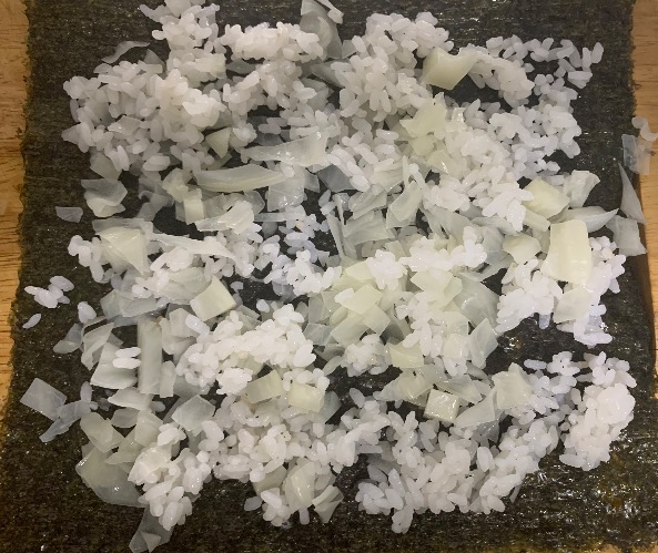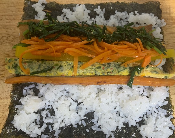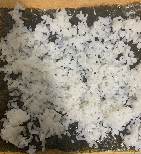 1. 김을 깔고 밥을 고르게 펴줬어요.